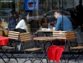 Young people drinking coffee and looking at mobile phones in a bar in the center of Tirana. People are enjoying the high temperatures on this winter day sitting outside the bars and walking in the streets of the city.