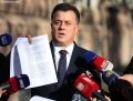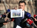 DP MP, Flamur Noka speaking to journalists after a meeting of the DP parliamentary group, with MPs who support former Prime Minister Sali Berisha. Noka showed a photo of the head of the Supreme Court, Sokol Sadushi, after placing flower crowns during a socialist party event, accusing him of being captured by the government.