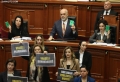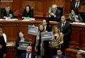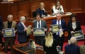 MPs Kastriot Piroli, Lindita Metaliaj, Alba Vokshi, Ervin Salianji and Saimir Korreshi holding signs and blocking the pulpit during a parliamentary session in a moment of tension during a parliamentary session. During the session, the opposition deputies continued their action to obstruct the work of the parliament.
