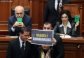 MP, Edmond Spaho, Oerd Bylykbashi, Kastriot Piroli and Lindita Metaliaj holding signs and blocking the pulpit during a parliamentary session in a moment of tension during a parliamentary session. During the session, the opposition deputies continued their action to obstruct the work of the parliament.