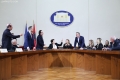 MPs Toni Gogu, Xhemal Qefalia and Blendi Klosi in a moment of tension during a session of the commission for electoral reform. The opposition MPs blocked the session, taking the seats of the commission members, while Metaliaj and Vokshi took the seats of the chairmen Gjiknuri and Alibeaj. This is the second time that opposition MPs block the session.