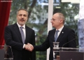 Minister for Europe and Foreign Affairs, Igli Hasani and Turkish Foreign Minister, Hakan Fidan after a press conference after an official reception of the Turkish minister in Tirana. Minister Hasani evaluated the advancement of Turkey-Albania relations, as he emphasized that there is potential between the two countries for a further intensification of economic relations and not only that.