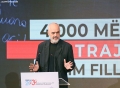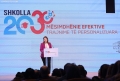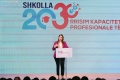Andi Dobrusha speaking during a government ceremony, where the National Program for the Professional Development of Teachers was launched 2024-2025. This program aims to empower teachers through training and innovative teaching methods.