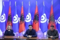 The chairman of the democratic party, Lulzim Basha and MPs Flutura Acka and Kreshnik Collaku speaking during a press conference from the new offices of the democratic party. Basha has ironized the actions of the MPs who support former Prime Minister Sali Berisha in the parliament.