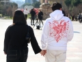 VALENTINE'S DAY IN TIRANA - A couple walking hand in hand in Skanderbeg Square, decorated on the occasion of Valentine's Day.
