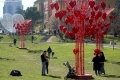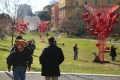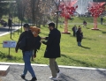 Citizens walking in Skanderbeg Square, decorated on the occasion of Valentine's Day.