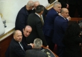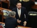 MPs Dashnor Sula and Xhelal Mziu during a parliamentary session, in which the opposition tried to obstruct it. After the vote, the agreement for migrants signed last November in Rome by Prime Minister Edi Rama and Italian Prime Minister Giorgia Meloni was approved.
