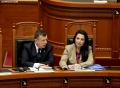 The head of the parliamentary group of the SP, Bledar Cuci and the MP Jorida Tabaku after a parliamentary session, in which opposition MPs tried to obstruct. After the vote, the agreement for migrants signed last November in Rome by Prime Minister Edi Rama and Italian Prime Minister Giorgia Meloni was approved and the draft law for constructions in Protected Areas.