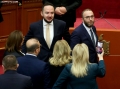 The head of the parliamentary group of the SP, Bledar Cuci and the MP Ermonela Felaj after a parliamentary session, in which opposition MPs tried to obstruct. After the vote, the agreement for migrants signed last November in Rome by Prime Minister Edi Rama and Italian Prime Minister Giorgia Meloni was approved, and the draft law for constructions in Protected Areas.