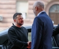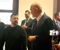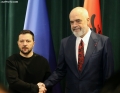 Prime Minister Edi Rama and Ukrainian President Volodymyr Zelensky shake hands inside the premises of the Prime Minister's Office, as part of an official reception ceremony. Zelensky visited Prime Minister Rama before participating in the Summit for Ukraine and Southeast Europe in Tirana