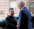Prime Minister Edi Rama and Ukrainian President Volodymyr Zelensky entering the premises of the prime minister's office in Tirana, as part of an official reception ceremony. Zelensky visited Prime Minister Rama before participating in the Summit for Ukraine and Southeast Europe in Tirana