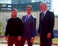 Prime Minister Edi Rama, Serbian President, Aleksandar Vucic and the President of Ukraine, Volodymyr Zelensky posing during an official reception ceremony before the Summit for Ukraine and Southeast Europe in Tirana. The focus of the first day of the Summit in Tirana is the support of Ukraine against Russian aggression.