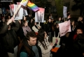 Citizens holding flags and banners during a protest on March 8, International Women's Day. Citizens have marched in the streets of Tirana against violence against women.
