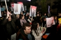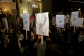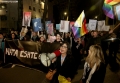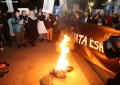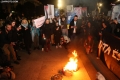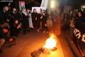 Citizens holding placards as they see bras burning during a protest on the occasion of March 8, International Women's Day. Citizens have marched in the streets of Tirana against violence against women.