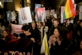 Zhaklin Lekatari and citizens holding flags and banners during a protest on the occasion of March 8, International Women's Day. Citizens have marched in the streets of Tirana against violence against women.