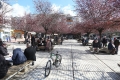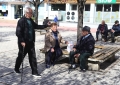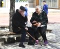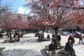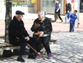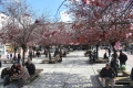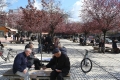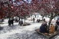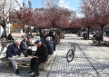 Pensioners resting in the flower garden near XHamllik in Tirana, under the shade of red plum blossoms that bloomed in the first days of spring.