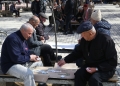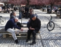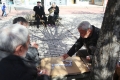 Pensioners playing dominoes and resting in the flower garden near XHamllik in Tirana, under the shade of red plum blossoms that bloomed in the first days of spring.