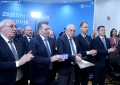 MPs Fatmir Mediu, Oerd Bylykbashi, Besnik Mustafaj dhe Luciano Boci during an event organized in the premises of the PD headquarters, as part of the 15th anniversary of Albania's membership in the Treaty Organization North Atlantic (NATO).