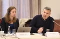 Journalists Antoine Bernard and Klodiana Lala, during a meeting organized by the Albanian Media Council and Reporters Without Borders, to discuss the challenges of journalism in Albania.