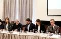 Journalists Antoine Bernard, Koloreto Cukali and Klodiana Lala and the head of the EU delegation in Tirana, Ambassador Silvio Gonzato, during a meeting organized by the Albanian Media Council and Reporters Without Borders, to discuss the challenges of journalism in Albania.
