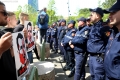Citizens and police forces during a protest before the Tirana municipality. The protest was organized by the Alliance for the Protection of the Theater, an opposition MP and a supporter of Reestablishment. The protest was called after the arrest by order of SPAK of some former directors of this municipality, while the resignation of the mayor, Erion Veliaj, was also demanded.