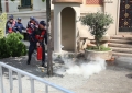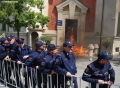 Police forces standing in front of the Tirana municipality, while a Molotov cocktail bursts behind them during a protest. The protest was organized by the Alliance for the Protection of the Theater, an opposition MP and a supporter of Reestablishment. The protest was called after the arrest by order of SPAK of some former directors of this municipality, while the resignation of the mayor, Erion Veliaj, was also demanded.