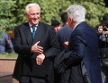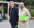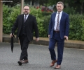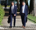 MPs Agron Gjekmarkaj and Gazment Bardhi entering the premises of the parliament for a parliamentary session. On the agenda is the interview with the Minister of Defense, Niko Peleshi, called by MP Nasip Naco.