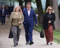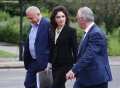 MPs Flutura Acka, Enekelejd Alibeaj and Eralda Bano entering the premises of the parliament for a parliamentary session. On the agenda is the interview with the Minister of Defense, Niko Peleshi, called by MP Nasip Naco.