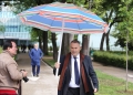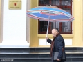 MP Asllan Dogjani entering the premises of the parliament for a parliamentary session, holding a beach umbrella in his hand. Dogjani has kept the umbrella, as a sign of irony to the statement of former minister Olta Xhacka.