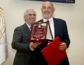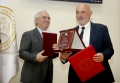 The Head of the Academy of Sciences, Skender Gjinushi and Researcher Dhimiter Popa at the moment of the award presentation during the ceremony honoring Theofan Popa (posthumously) with the Honor of the Academy award, for his contribution to the field of iconography and church heritage.