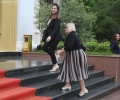 Minister of Tourism and Environment, Mirela Kumbaro and MP Laert Duraj entering the parliament building for a parliamentary session. While the deputies entered the parliament, the miners protested about their pensions.