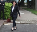 Minister of Health and Social Protection, Albana Kociu entering the parliament building for a parliamentary session. While the deputies entered the parliament, the miners protested about their pensions.