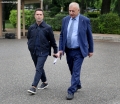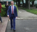 MP Enkelejd Alibeaj entering the parliament building for a parliamentary session. While the deputies entered the parliament, the miners protested about their pensions.