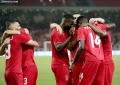 Partizan players celebrate scoring a goal during the football match, Partizani vs Skenderbeu, 1-0, valid for the Final Four phase of the Albanian Super Leagur, played at the Air Albania stadium in Tirana.