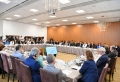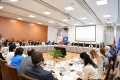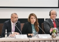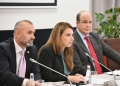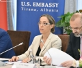 The Minister of Justice, Ulsi Manja, the President of the High Judicial College, Naureda Llagami, the US Charge d'Affaires in Tirana, David Wisner and the Director of the Council of Europe office in Tirana, Giulia Re speaking during a round table the discussion where the National Strategy for the Reduction of Backlog Issues was presented. The event was organized by the Supreme Judicial College to speed up the trial of 114,000 pending cases.