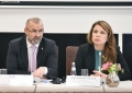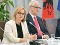 The Minister of Justice, Ulsi Manja, the President of the High Judicial College, Naureda Llagami, speaking during a round table the discussion where the National Strategy for the Reduction of Backlog Issues was presented. The event was organized by the Supreme Judicial College to speed up the trial of 114,000 pending cases.
