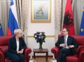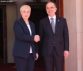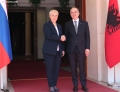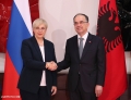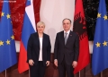 President Bajram Begaj and Slovenian President Natasa Pirc Musar posing in front of the door of the presidency, during an official reception ceremony near the Presidency.