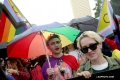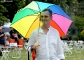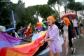 The head of the EU delegation in Tirana, Ambassador Silvio Gonzato, with a rainbow umbrella in front of the Pride Parade, while other members hold rainbow flags and banners. The march started from the Reja installation towards the Prime Minister and the Presidency.