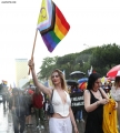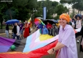 PARADE OF THE LGBTQ+ COMMUNITY - Member of the LGBTQ+ Alliance, Xheni Karaj speaking during the Pride Parade, while other members hold rainbow flags and banners. The march started from the Reja installation towards the Prime Minister and the Presidency.