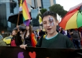 Member of the LGBTQ+ Alliance, Xheni Karaj speaking during the Pride Parade, while other members hold rainbow flags and banners. The march started from the Reja installation towards the Prime Minister and the Presidency.