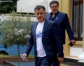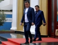 MP Flamur Noka and Edi Paloka exiting the parliament after a parliamentary session. During it, a draft resolution, two draft laws and a draft decision were approved