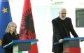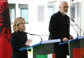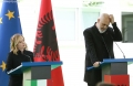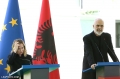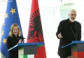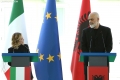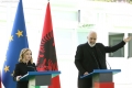 RAMA AND MELONI AT THE CONFERENCE - Albanian Prime Minister Edi Rama and Italian Prime Minister Georgia Meloni before a press conference in the premises of a reception center for immigrants in Shengjin, near Lezhe. The controversial agreement for the reception of migrants rescued in Italian waters, approved by the Albanian parliament in February 2024 and regularly denounced by opposition parties in both countries, as well as by tender groups, provides for two reception centers near the Albanian port. in Shengjin, where the immigrants will be for asylum, as well as an object near a former military airport in Gjader to house those who are waiting for an answer to their applications.