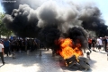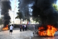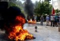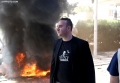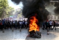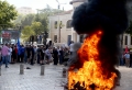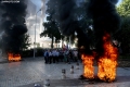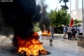 Tires burning during a protest in front of the parliament, while a parliamentary session is being organized inside the building. The protest came as a result of the Italian Rai3 channel's reporting on Albania.