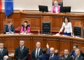 Minister of the Interior, Taulant Balla and Deputy Prime Minister and Minister of Infrastructure and Energy, Belinda Balluku in a parliamentary session. A re-establishment protest was organized outside the premises of the parliament, where the protesters clashed with the police forces, as a result of Rai 3's report on Albania.