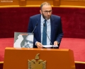 MP Asllan Dogjani speaking in a parliamentary session. A re-establishment protest was organized outside the premises of the parliament, where the protesters clashed with the police forces, as a result of Rai 3's report on Albania.