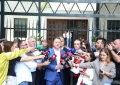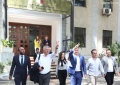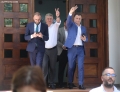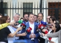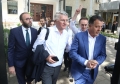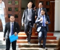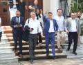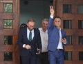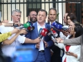 MPs Agron Gjekmarkaj, Flamur Noka, Gazment Bardhi holding up two fingers after leaving the Court of Appeal, as the latter has decided that the seal of the Democratic Party be returned to the group that supports former Prime Minister Sali Berisha, Reestablishment. The Court of Appeal has reinstated the decision of the judge Agron Zhukri.