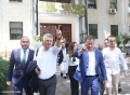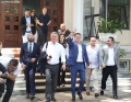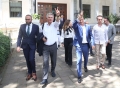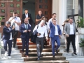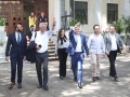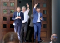 MPs Agron Gjekmarkaj, Flamur Noka, Gazment Bardhi and Luan Baci holding up two fingers after leaving the Court of Appeal, as the latter has decided that the seal of the Democratic Party be returned to the group that supports former Prime Minister Sali Berisha, Reestablishment. The Court of Appeal has reinstated the decision of the judge Agron Zhukri.