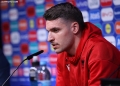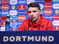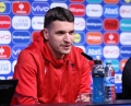 The player of the Albanian national football team, Berast Gjimshiti speaking at a press conference before the match between the Albanian national team and Italy, in the framework of the group stage for EURO 2024. This is the second time that Albania takes part in a European championship.