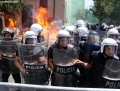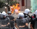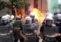 Police forces stand in front of the Tirana municipality, while a Molotov bar explodes behind them during a protest in front of the municipality of Tirana. The protest was organized by the Alliance for the Protection of the Theater, an opposition MP and a supporter of Reestablishment. The protesters have stated that the protests will continue until the mayor of Tirana, Erion Veliaj, resigns.