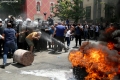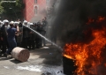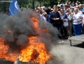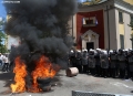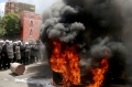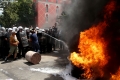 Police forces try to put out the flames during a protest in front of the municipality of Tirana. The protest was organized by the Alliance for the Protection of the Theater, an opposition MP and a supporter of Reestablishment. The protesters have stated that the protests will continue until the mayor of Tirana, Erion Veliaj, resigns.